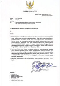 Permintaan ini disampaikan Mualem melalui surat Nomor 500/10/18536 tertanggal 28 November 2025. Dalam surat tersebut, Mualem meminta keringanan pengisian BBM bersubsidi dan pembebasan kewajiban barcode, mengingat bencana hidrometeorologi yang melanda Aceh telah melumpuhkan listrik, jaringan internet, hingga akses jalan yang terputus akibat longsor dan jebolnya sejumlah jembatan.