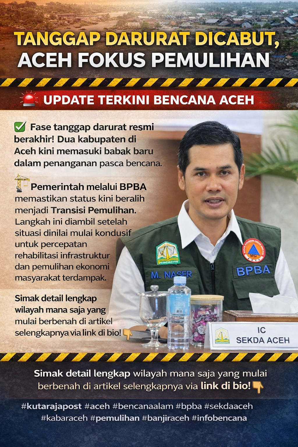 Sementara itu, Kabupaten Bener Meriah menetapkan status transisi darurat ke pemulihan selama 90 hari, mulai 7 Januari hingga 6 April 2026.