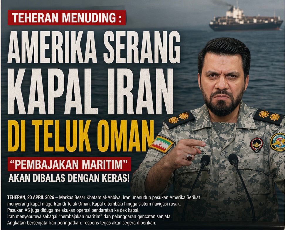 TEHERAN 20 April 2026 (kutarajapost) – Ketegangan di perairan internasional kembali memanas setelah Markas Besar Khatam al-Anbiya, Iran, mengeluarkan pernyataan keras menuduh pasukan Amerika Serikat melakukan serangan terhadap sebuah kapal niaga di Teluk Oman. Insiden ini dinilai sebagai pelanggaran gencatan senjata dan tindakan ilegal.