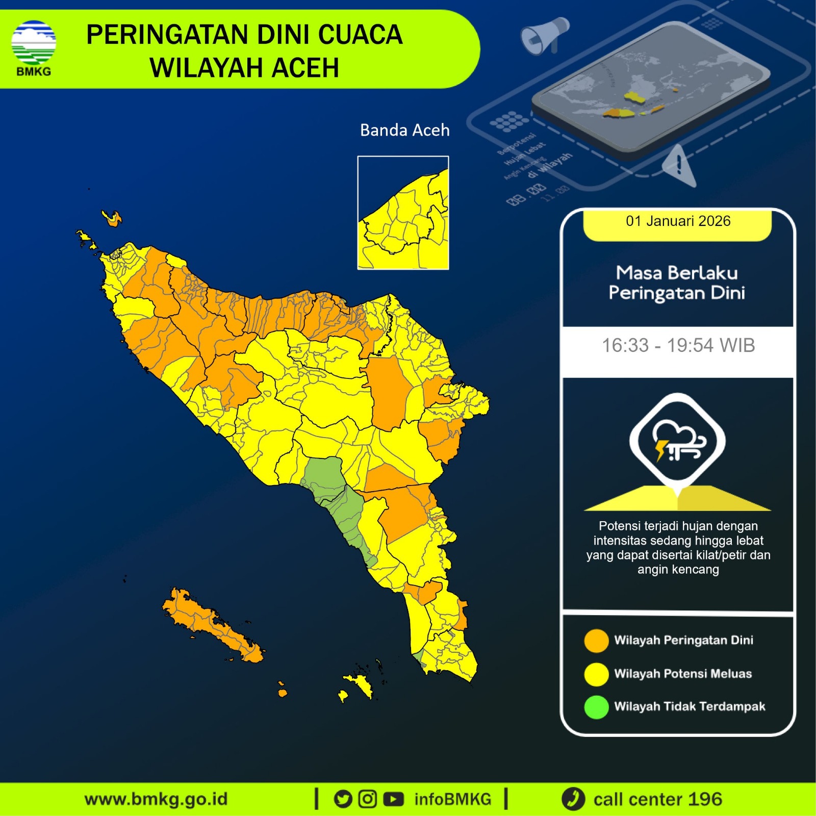 Banda Aceh - Sejumlah daerah di Aceh yang terdampak banjir dan longsor pada akhir November 2025 lalu, masih berpotensi kembali diguyur hujan intensitas sedang hingga lebat. Kondisi ini diperkirakan terjadi pada Kamis sore (1/1/2026) hingga malam hari yang disertai kilat, petir, dan angin kencang. Juru Bicara Posko Penanganan Banjir dan Longsor Aceh, Murthalamuddin, mengatakan peringatan dini tersebut merujuk pada prakiraan BMKG Stasiun Meteorologi Kelas I Sultan Iskandar Muda Banda Aceh....