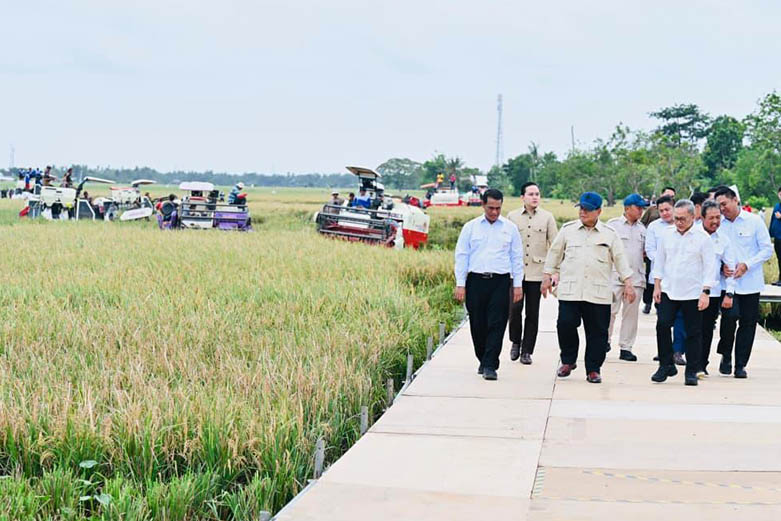 Setelah itu, Presiden Prabowo berjalan menuju hamparan sawah di dekat lokasi acara. Padi menguning siap dipanen terbentang luas. Di sekitar sawah terlihat beberapa drone pertanian yang digunakan untuk mendukung proses produksi.