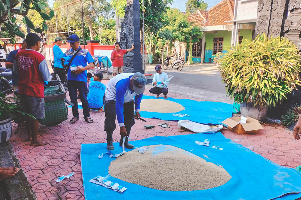 Suasana di Desa Kedungupit terlihat ramai. Petani bergotong royong memasang umpan di pematang sawah. Mereka berharap hasil panen mendatang lebih terjaga dari serangan tikus.[]