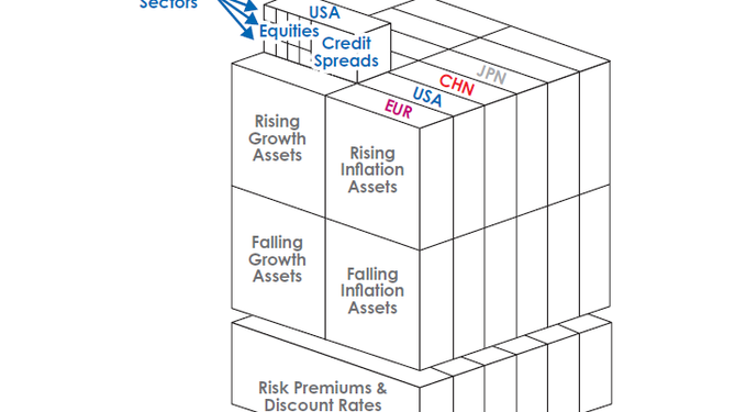 Bagi saya setiap aset investasi mencerminkan pendorong-pendorong ini dengan caranya sendiri yang logis dengan mempertimbangkan efek pada arus kas masa depannya. Setiap aset investasi adalah blok bangunan untuk portofolio, dan tantangannya adalah menyusun portofolio dengan baik dengan mempertimbangkan hal-hal ini. Misalnya, ketika pertumbuhan lebih kuat dari yang diharapkan, dengan asumsi semua hal sama, harga saham kemungkinan akan naik, dan ketika pertumbuhan dan inflasi lebih tinggi dari yang diharapkan, harga obligasi kemungkinan akan turun. Tujuan saya adalah menyatukan blok-blok bangunan ini dalam portofolio yang terdiversifikasi dengan baik dan dimiringkan secara taktis berdasarkan apa yang sedang terjadi atau akan terjadi di dunia yang memengaruhi keempat pendorong ini. Blok-blok bangunan ini dapat dipecahkan berdasarkan negara, berdasarkan bias lingkungan, dan hingga ke tingkat sektor dan perusahaan individu. Ketika konsep ini dimasukkan ke dalam portofolio yang seimbang, itu terlihat seperti grafik berikut. Melalui lensa inilah saya melihat sejarah peristiwa, sejarah pasar, dan perilaku portofolio.