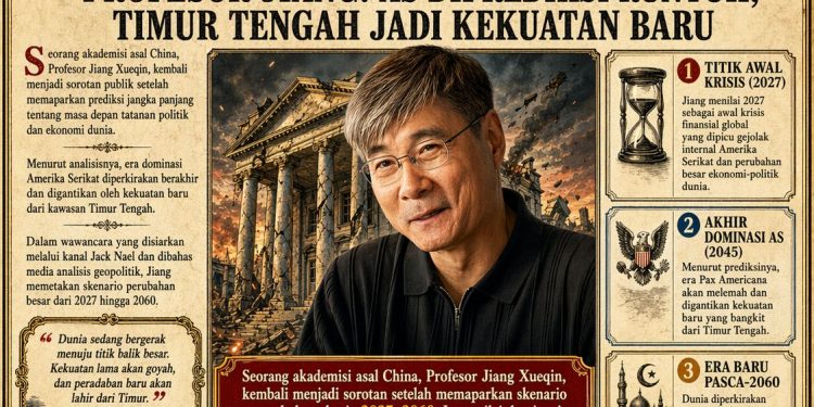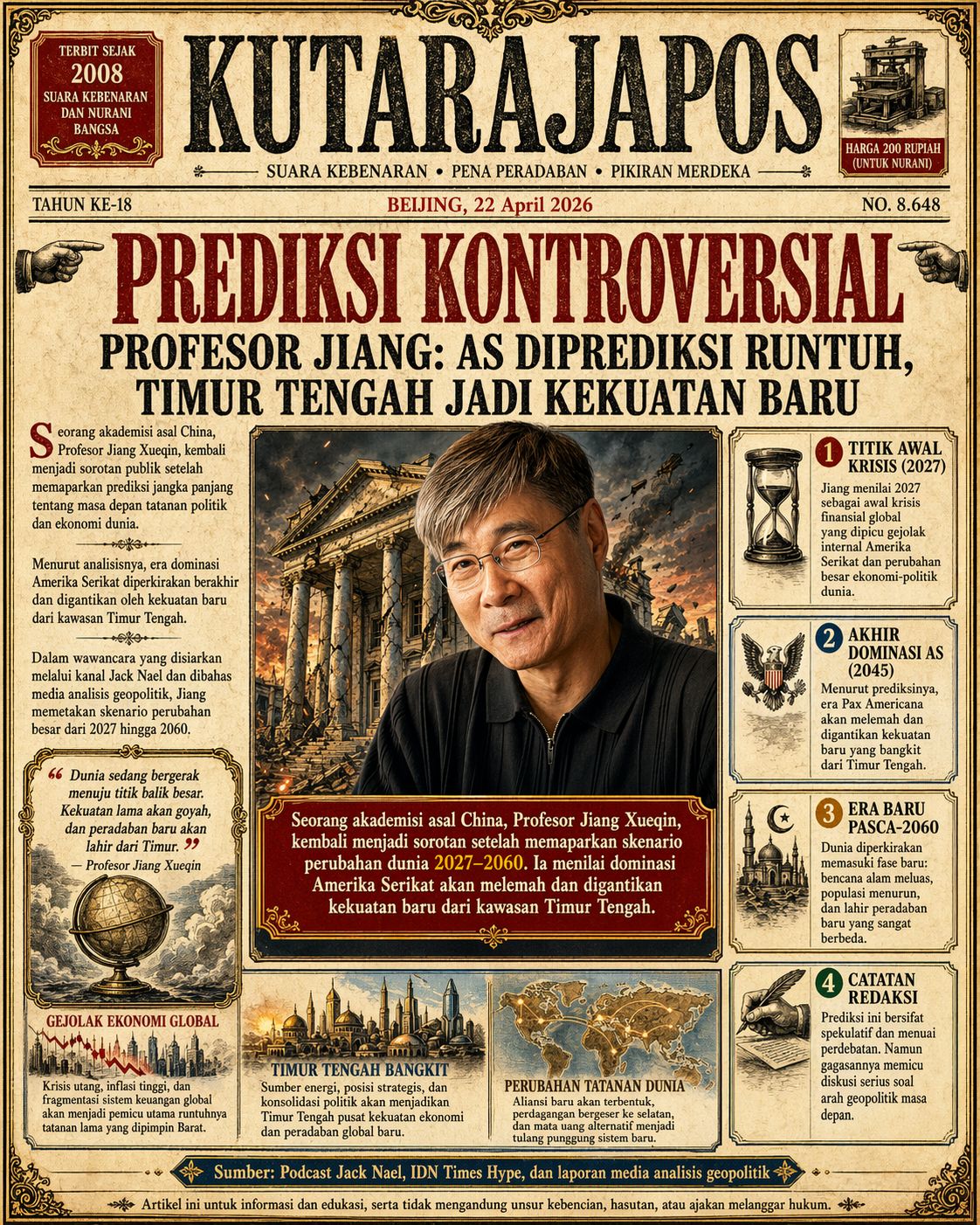 BEIJING 22 April 2026 (kutarajapos.com) – Seorang akademisi asal China, Profesor Jiang Xueqin, kembali menjadi sorotan publik setelah memaparkan serangkaian prediksi jangka panjang yang cukup mengejutkan mengenai masa depan tatanan politik dan ekonomi dunia. Menurut analisisnya, era dominasi Amerika Serikat diperkirakan akan berakhir dan digantikan oleh kekuatan baru yang muncul dari kawasan Timur Tengah.