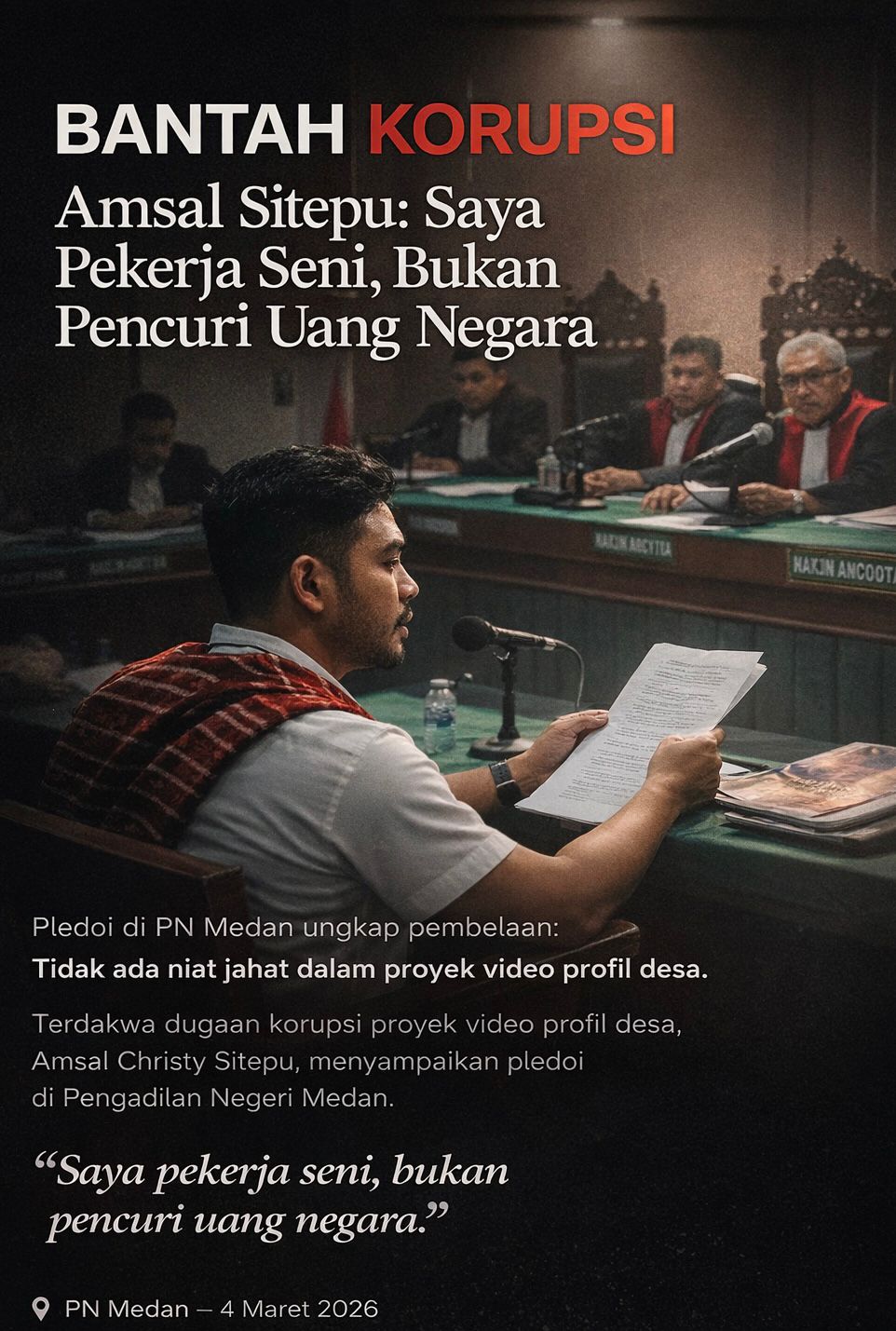 MEDAN, KUTARAJAPOST.COM – Terdakwa perkara dugaan korupsi proyek video profil desa di Kabupaten Karo, Amsal Christy Sitepu, menyampaikan nota pembelaan (pledoi) pribadinya dalam persidangan di Ruang Cakra 5, Pengadilan Negeri Medan, Rabu (4/3/2026).
